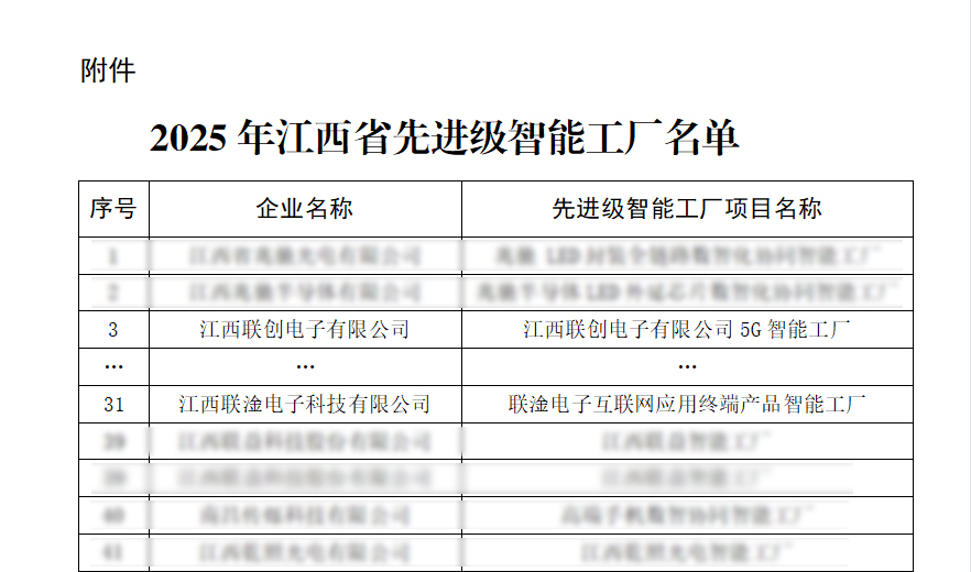 近日,江西省工业和信息化厅正式公布2025年江西省“先进级智能工厂”名单,186家企业入选。其中乐动平台,乐动(中国)一站式服务平台、江西联淦电子科技有限公司2家联创电子系企业名列榜单。这标志着公司在智能制造领域的创新成果再次获得政府权威认可。
